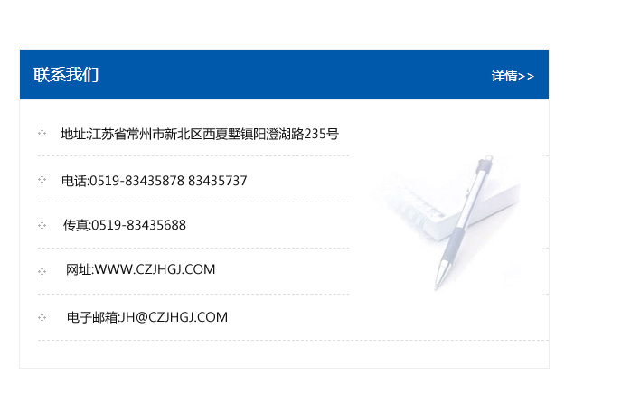 傳真:0519-83435688    郵編:213135    網址:WWW.czjhgj_com.wxhqcw.com    電子郵箱:JH@czjhgj_com.wxhqcw.com